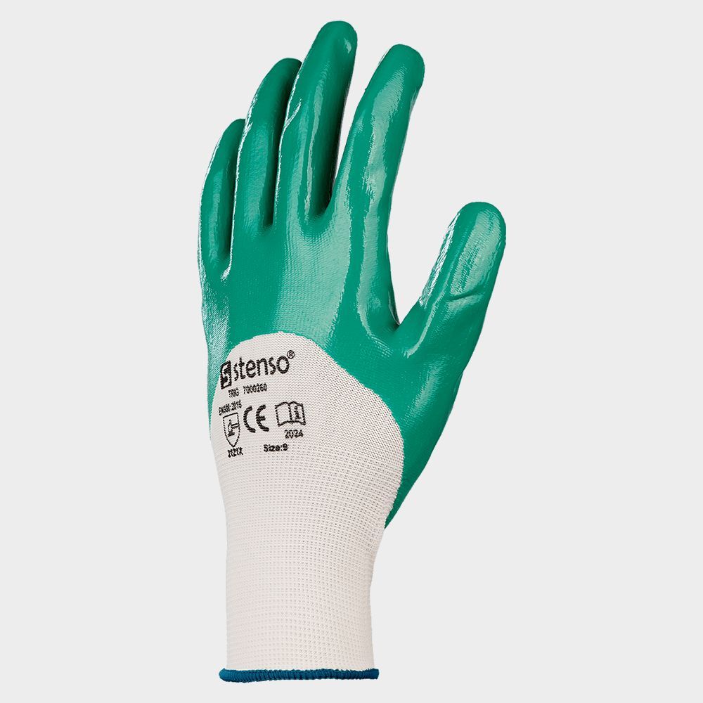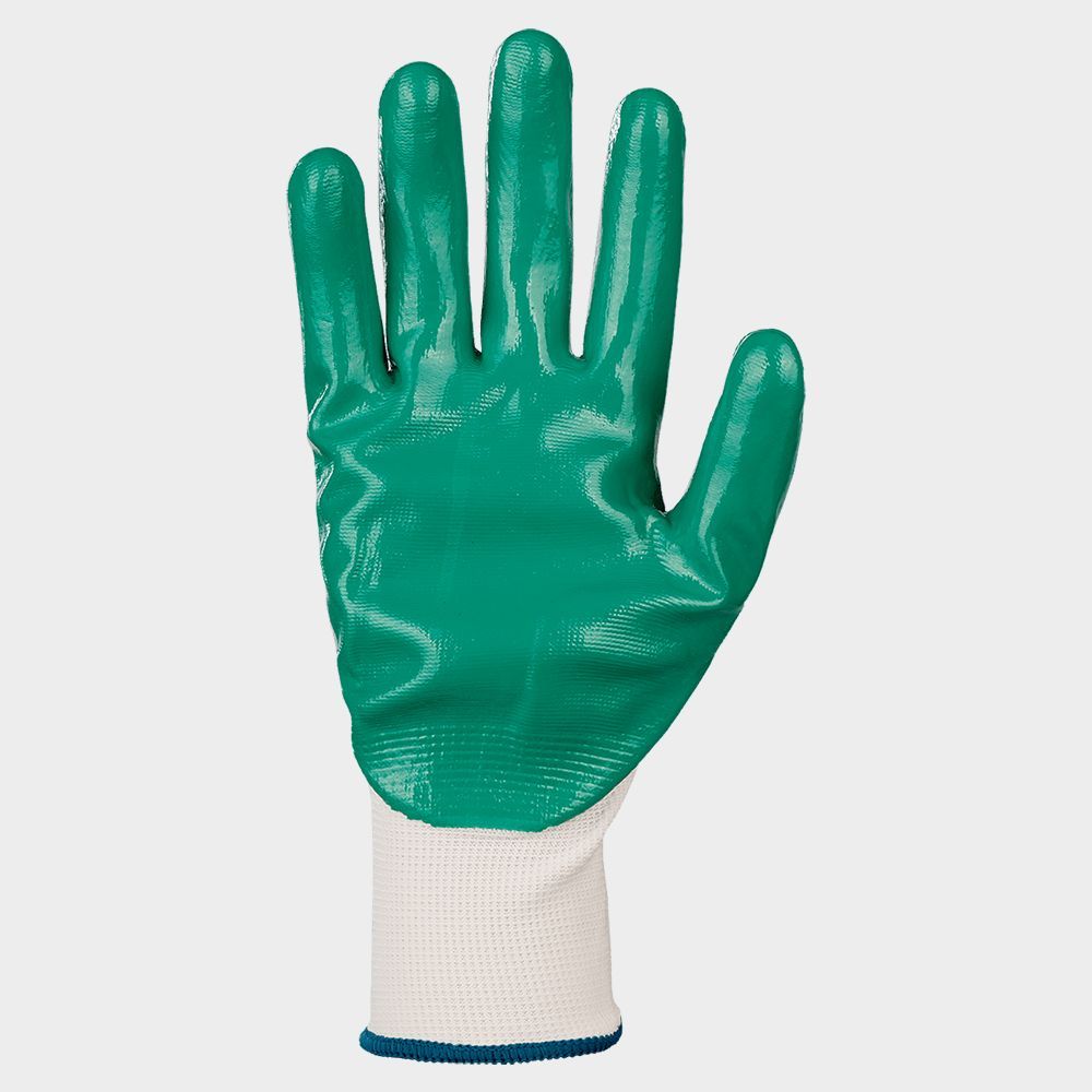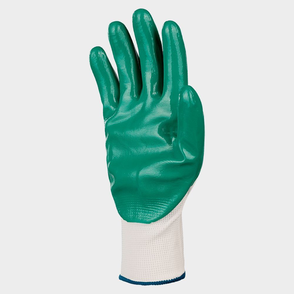 Ελαφριά και αναπνεύσιμα λευκά γάντια πολυεστέρα με λεία επίστρωση 3/4 πράσινου νιτριλίου για κράτημα και προστασία. ΜΕΓΕΘΟΣ: 9,10 EN 388