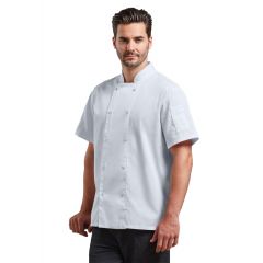 Κοντά μανίκια - Γιακάς τύπου μάο - Κρυφό κουμπί στο κολάρο - Τσέπη για στυλό στο αριστερό μανίκι - Πλαϊνά σκισίματα - Πλάτη από διαπνέον δίχτυ Coolchecker®