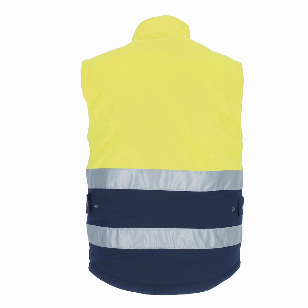 Γιλέκο με πολλαπλές τσέπες υψηλής ορατότητας. Κατασκευασμένο από ανθεκτικό και ανθεκτικό εξωτερικό ύφασμα twill με λεία εσωτερική επένδυση και εσωτερική καπιτονέ για την εξασφάλιση εξαιρετικής θερμομόνωσης, περιλαμβάνει δύο ραμμένες αντανακλαστικές ταινίες στον κορμό και την πλάτη για πρόσθετη ασφάλεια. Ένδυμα πιστοποιημένο ως ΜΑΠ Υψηλής Ορατότητας Κατηγορίας II με βάση τα πρότυπα 13688 και 20471, κατηγορία 1, μέγιστη διάρκεια ζωής 25 πλύσεων. όρθιος γιακάς με φερμουάρ με φερμουάρ και κλείσιμο με κουμπιά μπροστά, ελαστικό αντιανεμικό στις μασχάλες, ρυθμιζόμενη μέση με πλαϊνό κούμπωμα για καλύτερη εφαρμογή, ουρά που καλύπτει την οσφυϊκή ζώνη για μεγαλύτερη άνεση και παρέχει επίσης μεγάλη επιφάνεια εκτύπωσης. περιλαμβάνει θήκη για στυλό, δύο μπροστινές τσέπες με ζαρντινιέρες, δύο τσέπες στο στήθος, όλες με φερμουάρ, δύο πλαϊνές τσέπες και μια εσωτερική τσέπη για ασφαλή και βολική αποθήκευση και προβολή του branding. Περιλαμβάνει εσωτερικό φερμουάρ στην πλάτη για εύκολη σήμανση με διάφορες μεθόδους: μεταξοτυπία, εκτύπωση μεταφοράς, εφαρμογή βινυλίου, κέντημα, ραφή. Ιδανικό ως ρούχα εργασίας και στολές.