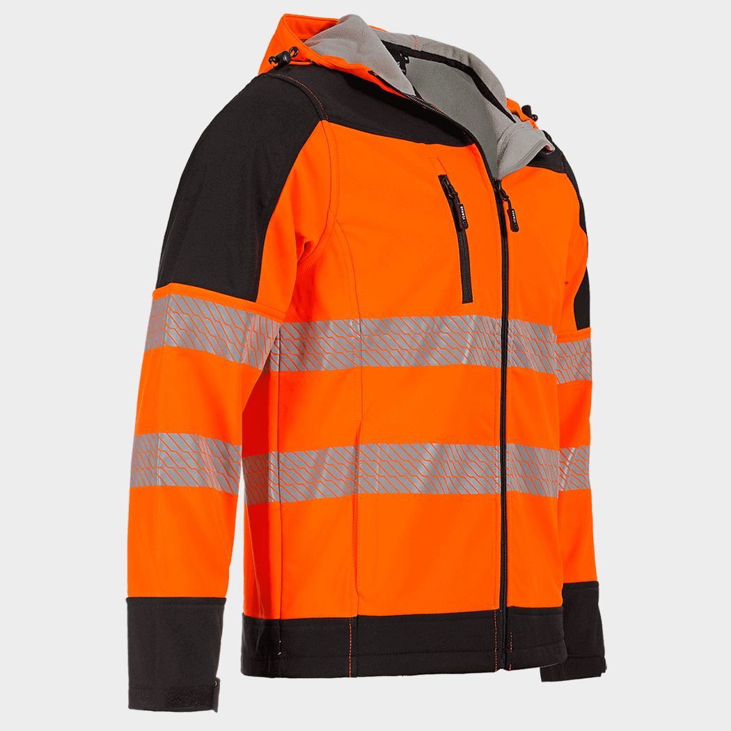 Μπουφάν softshell υψηλής ορατότητας με κουκούλα και ανακλαστικές λωρίδες στα μανίκια και τον κορμό, εξασφαλίζοντας υψηλή ορατότητα και ασφάλεια.