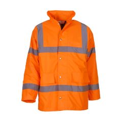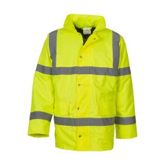 190 g/m² 100% Πολυεστέρας Μπουφάν ασφαλείας με ανακλαστικές κάθετες και οριζόντιες ρίγες μπροστά και πίσω Γιακάς με ενσωματωμένη κουκούλα Ολόσωμο φερμουάρ και πατιλέτα με κουμπιά (snap) Εσωτερική τσέπη, πλαϊνές τσέπες.