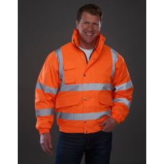 190 g/m² 100% Πολυεστέρας Μπουφάν bomber ασφαλείας με ανακλαστικές κάθετες και οριζόντιες ρίγες μπροστά και πίσω Γιακάς με ενσωματωμένη κουκούλα Ολόσωμο φερμουάρ και πατιλέτα με κουμπιά (snap) Εσωτερική τσέπη, τσέπη τηλεφώνου και πλαϊνές τσέπες Ελαστικό μανίκι και τελείωμα.