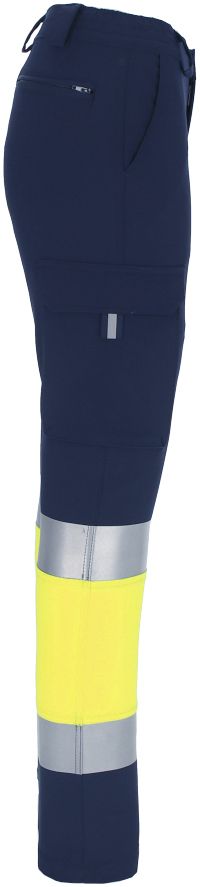 Υψηλής ορατότητας δίχρωμο παντελόνι πολλαπλών τσεπών. Κατασκευασμένο από σύνθετο ύφασμα bi-stretch για αυξημένη κινητικότητα και αδιάβροχο φινίρισμα για επιπλέον άνεση, περιλαμβάνει δύο θερμοκολλημένες αντανακλαστικές ταινίες στις μανσέτες των ποδιών για πρόσθετη ασφάλεια και απεριόριστη κίνηση. Ένδυμα πιστοποιημένο ως ΜΑΠ υψηλής ορατότητας κατηγορίας II βάσει των προτύπων 13688 και 20471, κατηγορία 1, μέγιστη διάρκεια ζωής 25 πλύσεων. κλείσιμο με φερμουάρ και κουμπί, ελαστική ζώνη στη μέση πίσω και στα πλάγια για καλύτερη εφαρμογή, διπλές κύριες ραφές και επιπλέον ενισχύσεις υψηλής φθοράς με ραβδώσεις ασφαλείας, που εξασφαλίζουν αντοχή και ανθεκτικότητα μακράς διάρκειας.Δύο λοξές τσέπες στο ισχίο, δύο πλαϊνές τσέπες με φάσα και δύο πίσω τσέπες, και οι τέσσερις με πτερύγιο και κλείσιμο με αγκίστρι και βρόχο και ένα δίχρωμο ανακλαστικό εξάρτημα για εύκολο άνοιγμα και ασφαλή και βολική αποθήκευση.uitable μέθοδοι σήμανσης: κέντημα, ραφή και θερμοκολλητικά αντι-υποκλιμάκωσης. Ιδανικά για ρούχα εργασίας και στολές.