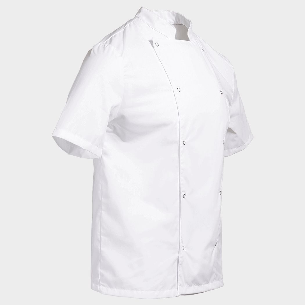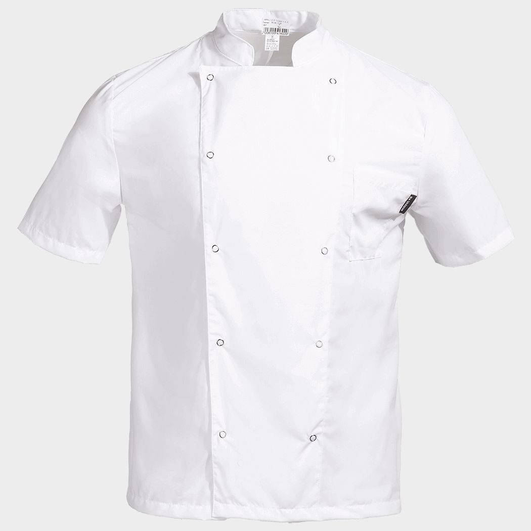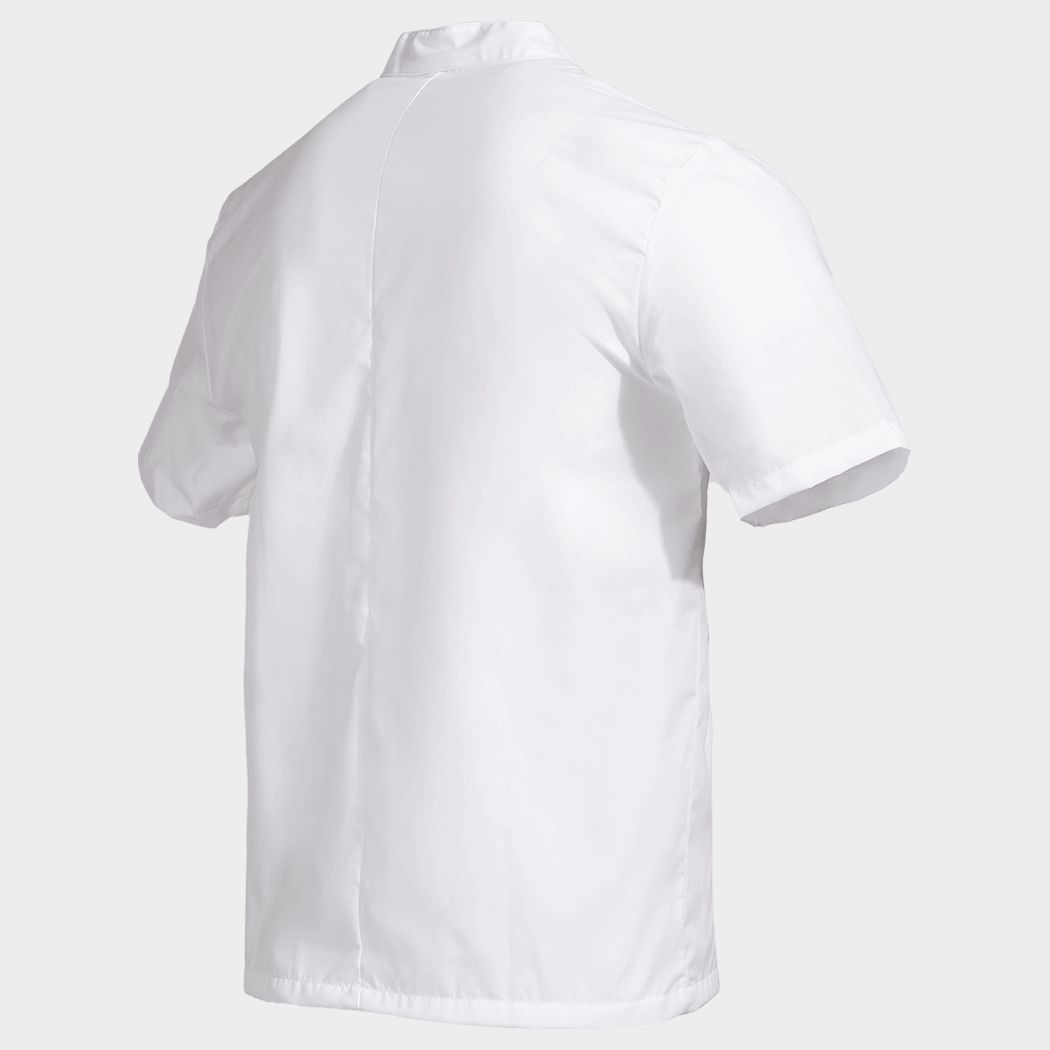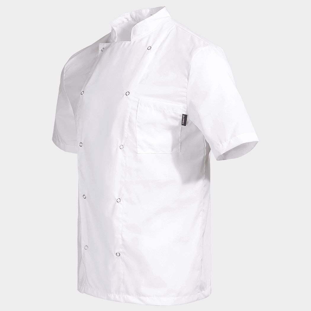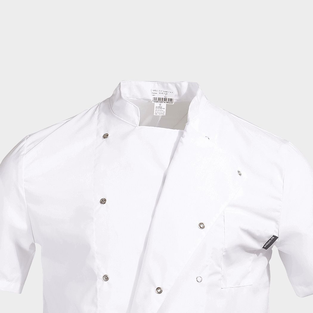 Σακάκι κουζίνας με κοντό μανίκι, κατασκευασμένο από υψηλής ποιότητας ύφασμα που αναπνέει. Παρέχει άνεση και ελευθερία κινήσεων κατά τη διάρκεια πολλών ωρών εργασίας. Διπλό κούμπωμα με κουμπιά tic-tac και λειτουργικές τσέπες στα μανίκια. Εύκολο στη συντήρηση και κατάλληλο για εντατική χρήση.