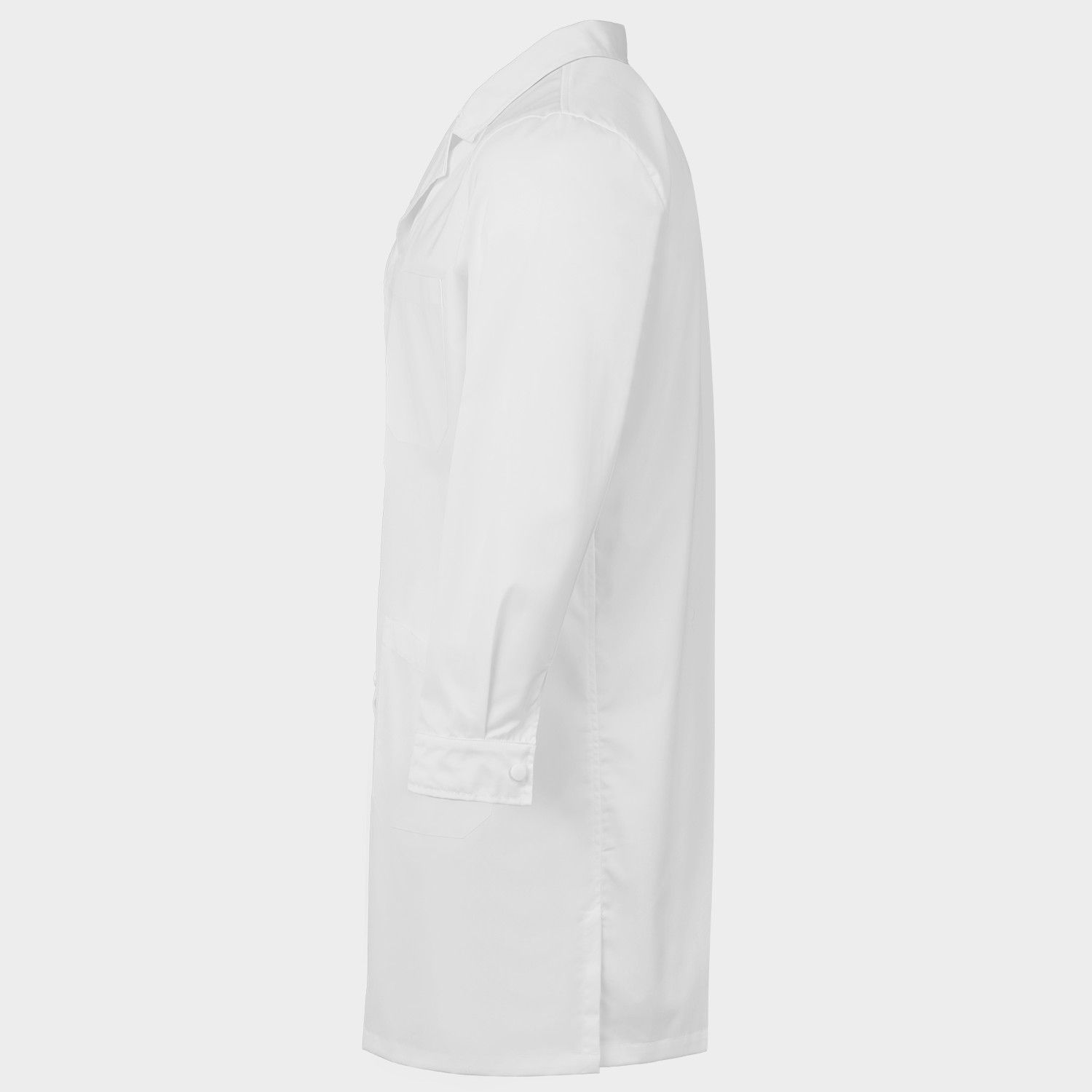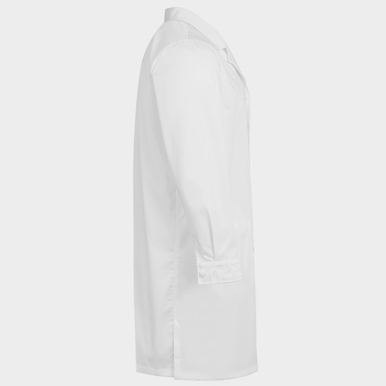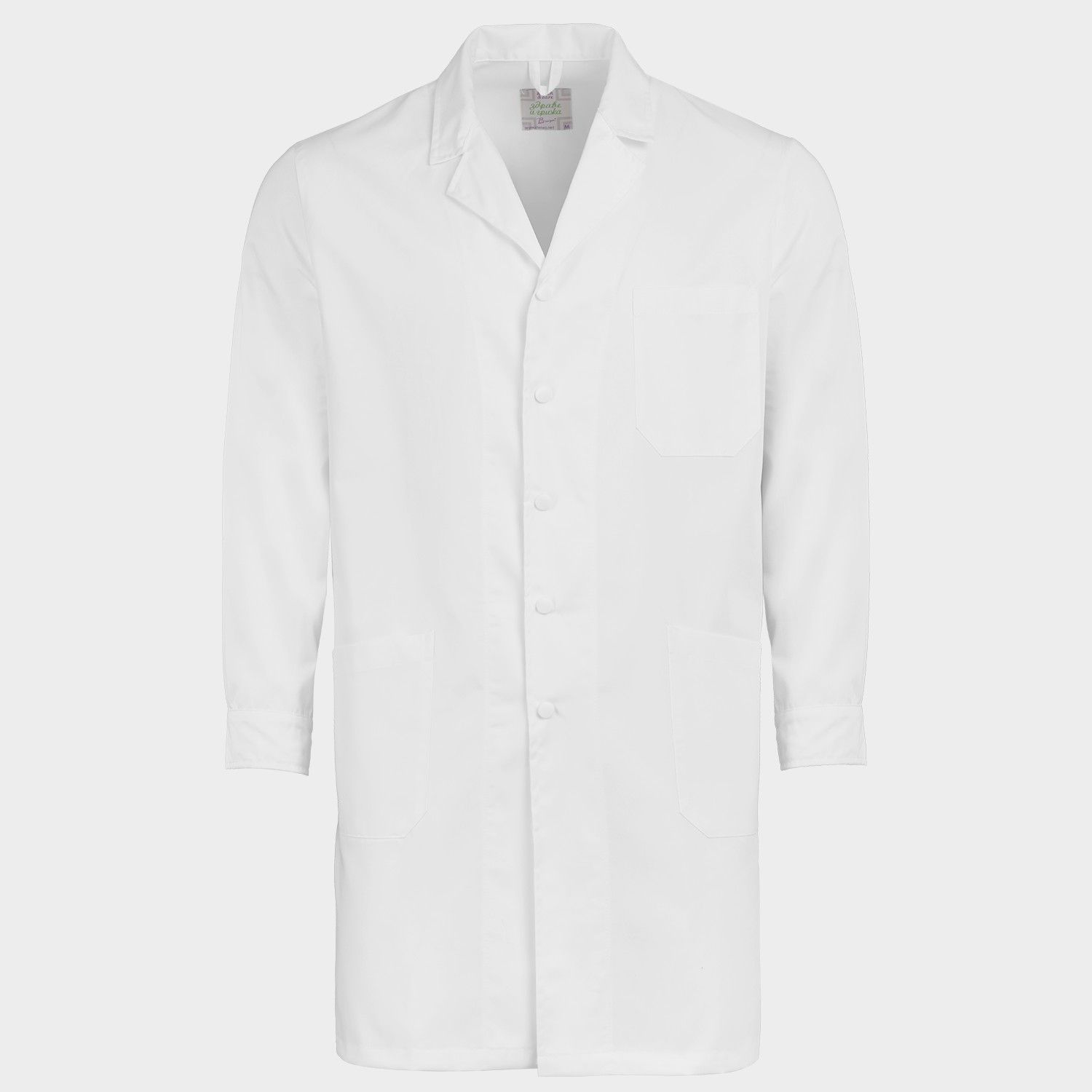 Ανδρική ποδιά με γιακά και πέτο, μακριά μανίκια, τρεις τσέπες και κούμπωμα με κουμπιά.